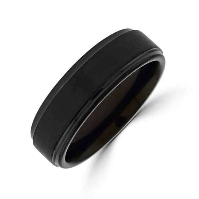 A flat court band ring, made in Black IP-plated Tungsten carbide with a brushed sleeve centre.