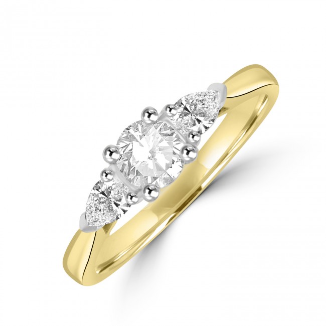 A handpicked and GIA certified Brilliant cut is set within two perfectly proportioned Pear cut diamonds. The wedding ring friendly mount is made in luxurious Platinum and set within the warm, rich tones of an 18ct yellow gold shank.