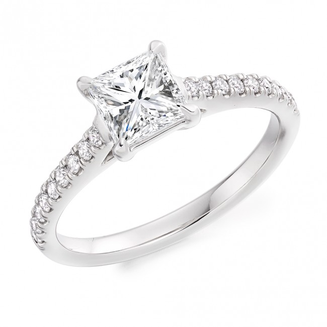 This 1.03ct Princess cut Diamond radiates fine, handpicked quality and has been certified by GIA (E colour, Si2 clarity, Excellent Polish, Very good Symmetry, Fluorescence None). Mounted in 4-claw underwired setting with a Platinum shank featuring castle set diamond shoulders.