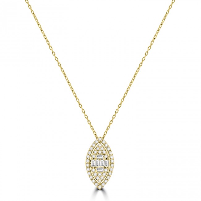 The claw set cluster pendant features a striking, marquise shaped outline. A total .38ct Diamond features six baguette cuts amidst an array of diamond brilliance. Made in warm and majestic 18ct yellow gold, the pendant comes fitted on an 18" belcher chain.