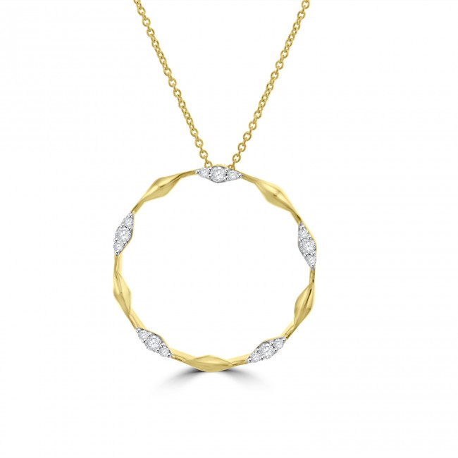 An open circle, beautifully shaped with a twist effect and five pave diamond set sections. Made in rich and majestic, 18ct yellow gold and fitted within an 18" belcher trace chain.