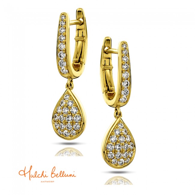 These eye-catching earrings feature warm and majestic, 18ct yellow gold saturated in fine white diamond. From huggy style, hinged hoops drops a pear shape with a rounded, concave surface. Beautifully designed and exquisitely manufactured by Hulchi Belluni, Belgium.