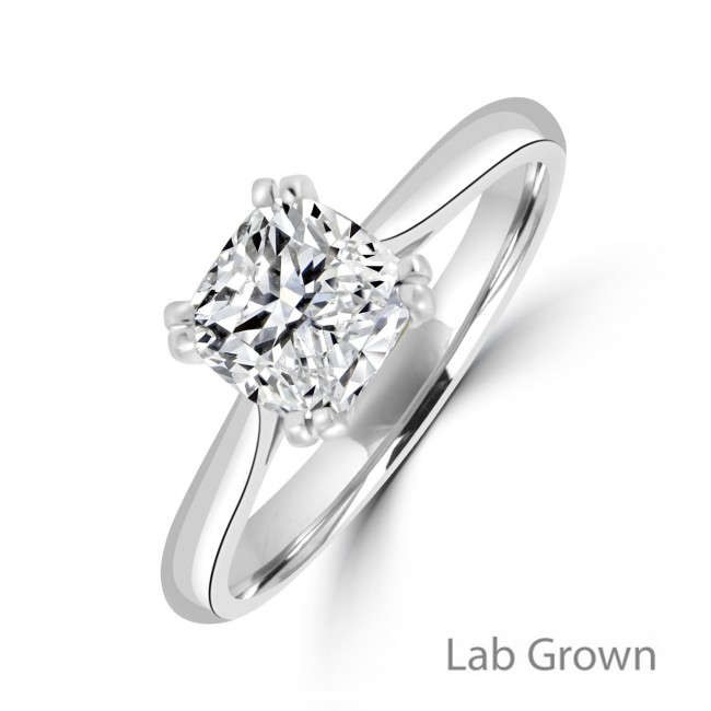 This Cushion modified Brilliant cut diamond is laboratory grown and accompanied with IGI Certification (E colour, VS2 clarity, Excellent Polish/Symmetry, Flourescence None). The Platinum setting features a double-tipped claw on each rounded corner. The mount allows for a perfect wedding ring fit.