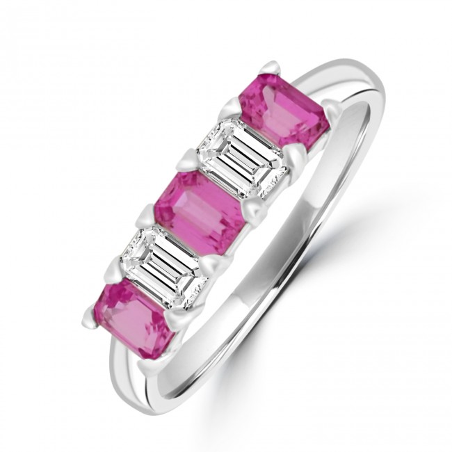 Set in silky 9ct white gold and featuring five baguette cuts, this coloured Eternity ring alternates three Pink Sapphires with two white Diamonds.