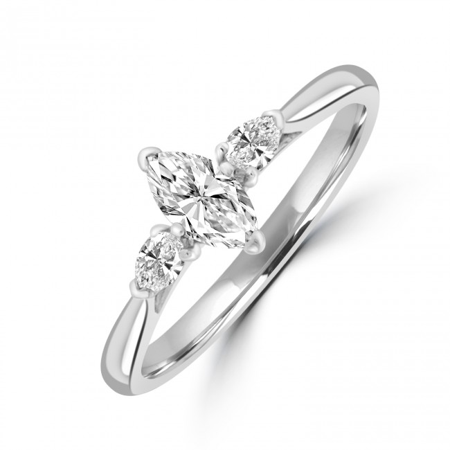 The Marquise cut in centre focus weighs .31ct and is accompanied with certification by GIA (D colour, VS2 clarity, Excellent Polish, Very Good Symmetry, Faint Fluorescence). Mounted between two smaller, pear cut diamonds the outline is elegant and striking. The Platinum mount is underwired to allow for a perfect wedding ring fit.