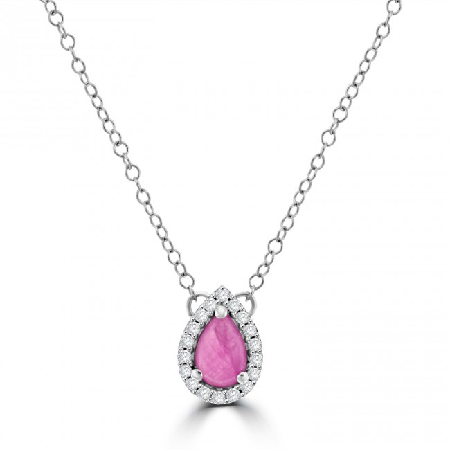 A beautiful pendant chain, featuring a cabochon, pear-shaped Pink Sapphire set in 9ct white gold and surrounded by a diamond halo. Sapphires from Greenland are nearly 3 billion years old and have been recently mined adhering to Responsible Environmental Laws, Best Business Practices, Social and Human Rights Standards. Your purchase supports the PinkPolarBear Foundation.