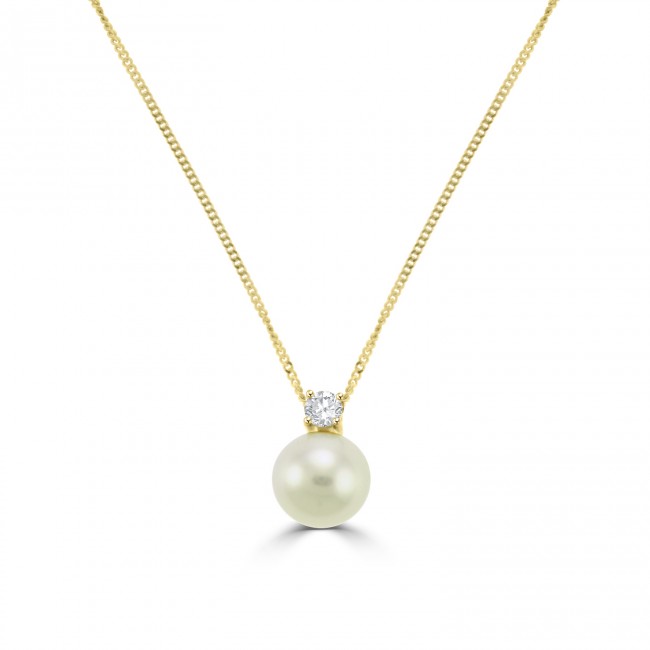 A round, brilliant cut white diamond is claw set above a fine grade Akoya cultured pear, measuring 8-8.5mm and radiating a rich lustre. The understated and beautifully elegant pendant is fitted on a 16" fine curb chain.