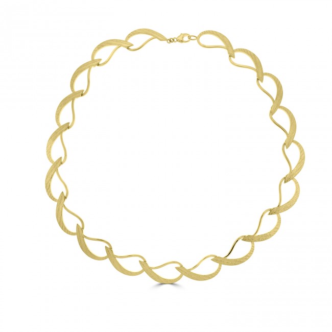 Representing the finest in contemporary jewellery manufacture, this stunning necklet is made in solid 9ct gold and features a sequence of "wave" shaped links that contrast high polished tones with a satin, textured effect. The links overlap and are interconnected seamlessly to add rigidity to the rounded shape of the collar. Made in Germany.