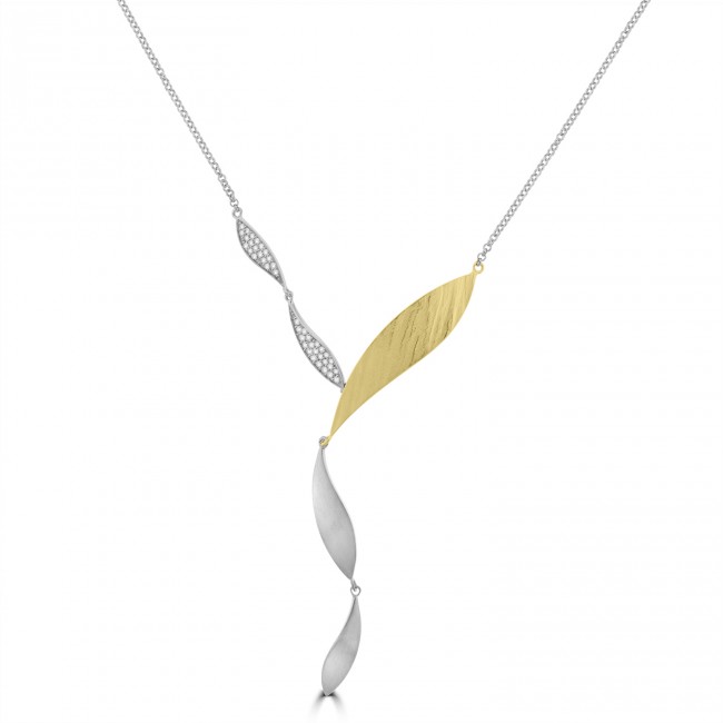 A fine, 18" belcher chain is fitted to a beautifully designed pendant, comprised of abstract, petal shapes that combine and contrast white and yellow satin tones with white stone brilliance.