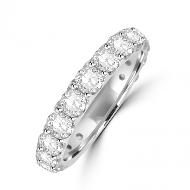 This heavy court shaped band is cut out and set with sixteen impressively sized, brilliant cut diamonds weighing 2.50ct collectively. The open, cog like setting appears "rippled" from the side profile. 80% of the segments feature a brilliant cut diamond with on left plain to allow for sizing. The band measures 3.5mm in width.