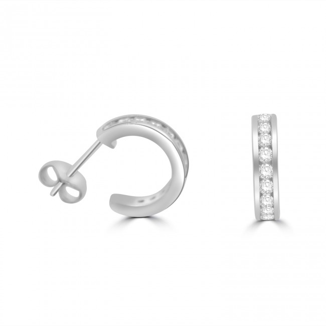 A solid hoop shaped channel of white cubic zirconia stones. The earrings are made in rhodium plated sterling silver and fitted by stem and butterfly back.