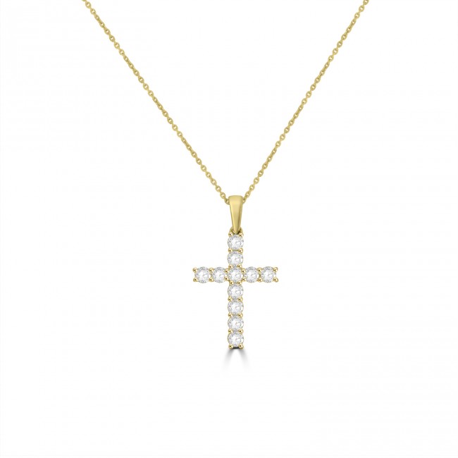 From a plain, yellow bale hangs a claw set cross, with eleven brilliant cut Diamonds, set 7x5. The pendant is fixed on a 16" trace chain.
