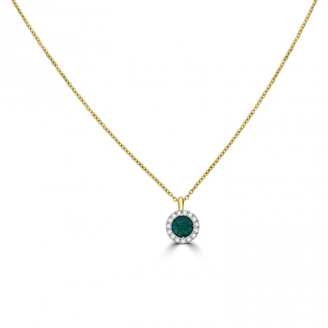 A round cut Emerald radiates desirable deep green tones in contrast to surrounding white diamond brilliance. The precious coloured gemstones is of natural Brasilian origin and enhanced by diffusion. The process is permanent and the emerald properties remain unchanged. The white gold setting is fitted by a plain yellow gold bale to an 18" trace belcher chain (with shortening ring).