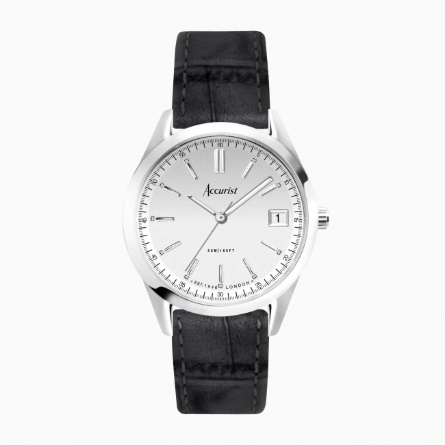 Silver Dial with Date Function in 36mm casing Black Leather Strap 50 Metres Water Resistant 74006