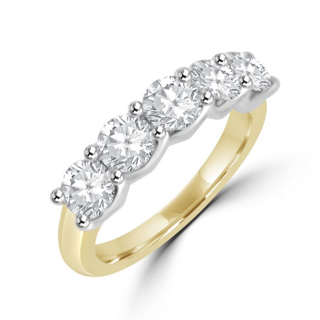 Five brilliant cut Diamonds have been handpicked for their seamless blend of white brilliance. Hand set in a shared claw with open v-shaped profile. The two tone mount complements the white diamond in luxurious platinum, whilst contrasting with the warm tones of an 18ct yellow gold shank.