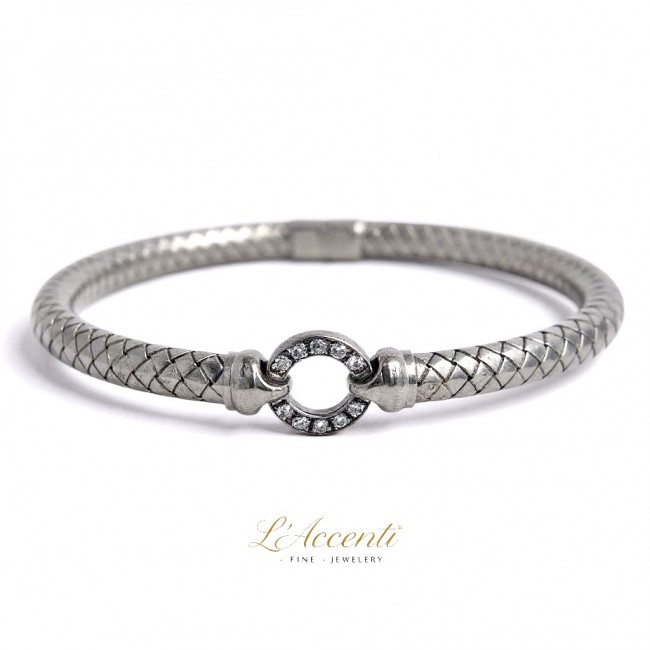 A grain set Circle of Life radiates white diamond brilliance from centre focus. The hinged bangle features an anaconda-style textured surface, expertly crafted in sterling silver. Representing the finest in Italian jewellery design and manufacture. Two sizes available (inside measurements):- Small: 60 x 50mm Large: 65 x 50mm