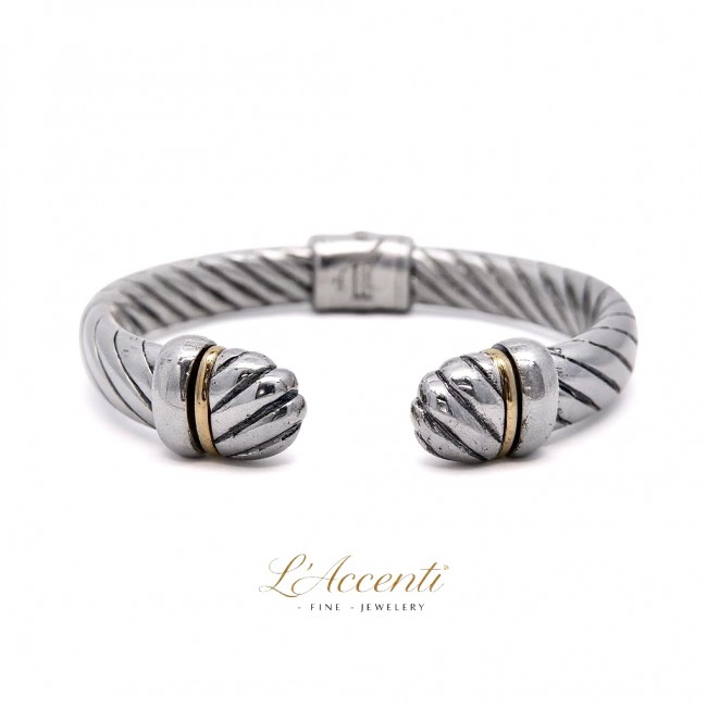 A beautiful court shaped profile features an enchanting 'twist' effect, with a width of 9.3mm. Ornate ends feature an 18ct yellow gold (2.6g) ringlet. The torq style bangle operates a hidden hinged mechanism. Exquisite design, made in Italy. Hallmarked 925 (silver) and 750 (18ct)