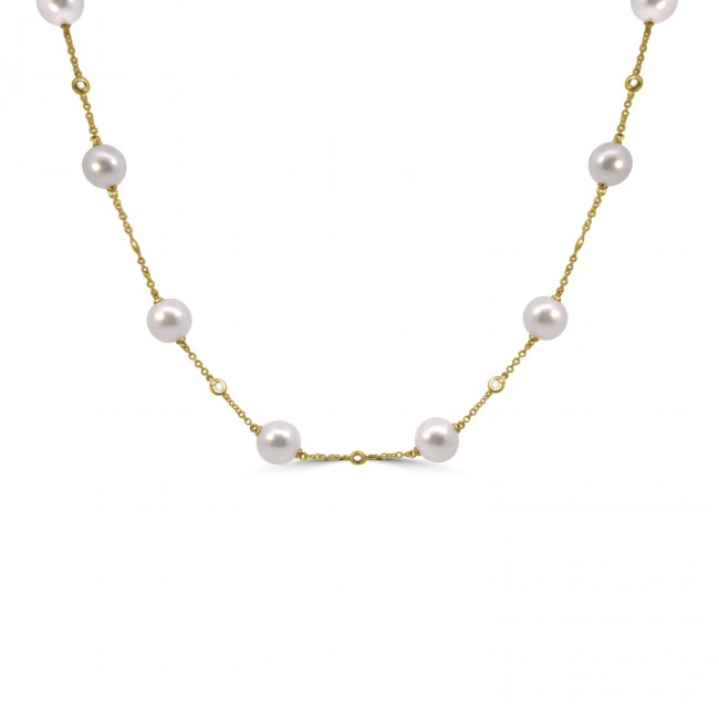 This beautiful necklet features fourteen Akoya cultured Pearls (measuring 8.5-9mm), alternating with fifteen brilliant cut diamonds, set flush in an 18ct yellow gold rubover setting. Fitted within a 20" length belcher chain, fastened by a parrot catch and fashioned in warm and majestic, 18ct yellow gold.