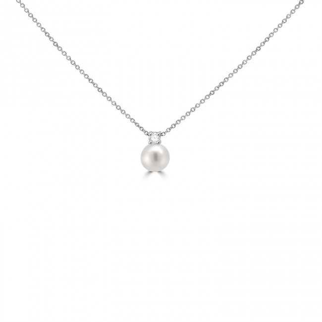 A brilliant cut white diamond is inset in silky 18ct white gold, 4-claw setting, fixed atop an Akoyal cultured pearl, measuring 7.5-8mm. The understated pendant is radiant with timeless beauty. Fitted seamlessly to an 18" trace chain, made in 18ct white gold.