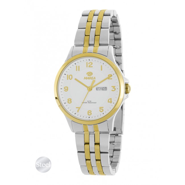 White dial with gold tones arabic detail. Stainless steel casing and bracelet finished in two-tone yellow gold.