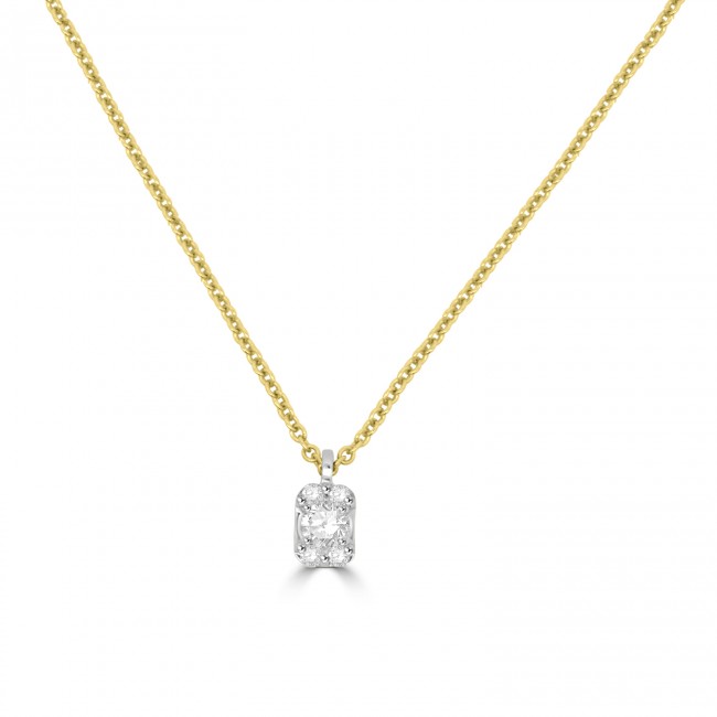 Beautifully elegant pendant, featuring an oblong shape, inset with five brilliant cut diamonds and crafted in silky white gold. The dazzling spectacle is fitted to a 16-18" yellow gold belcher chain.