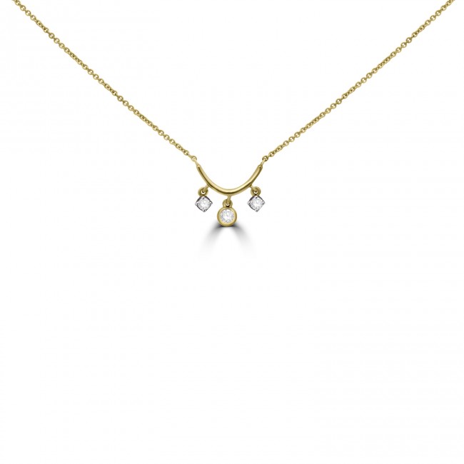 A beautiful necklet, featuring a U-shaped bar with three diamond tassle droppers. Crafted in the warms tones of 9ct yellow gold and fitted within a 17" belcher chain.