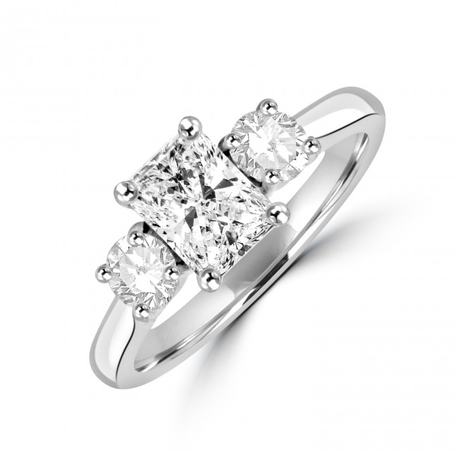 This Radiant cut Diamond exhibits striking symmetry in centre focus. Flanked by a smaller, brilliant cut on each side, and set in a subtle clawed platinum setting. The mount is underwired to allow for a perfect wedding ring fit. Radiant cut 1.00ct ~ GIA Report 1525217415 Certified E colour ~ Si1 clarity ~ Excellent Polish/Symmetry ~ Fluorescence None