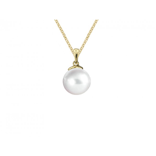 A plain, 9ct yellow gold bale is fixed to a white, freshwater pearl drop. Perfectly uniform with an impressive lustre and measuring 9-9.5mm. Please Note: Chain shown for illustrative purposes only ~ Sold separately