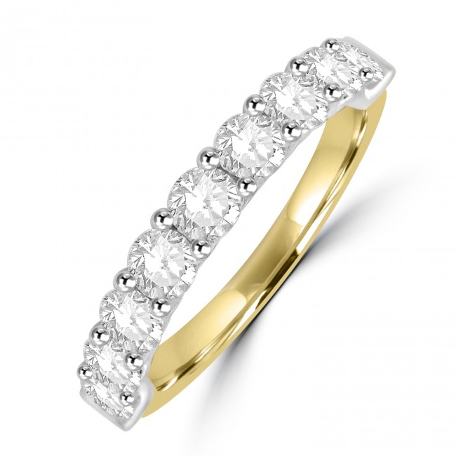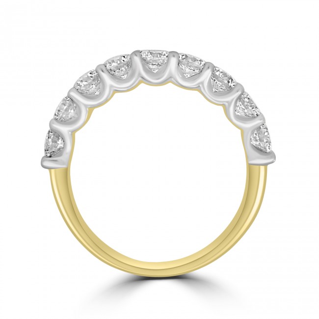 Nine round, brilliant cut diamonds blend seamless fine quality from within a shared claw setting, crafted in luxurious platinum. The side profile is open with looping cog (wheel) effect. The eternity ring is finished with a yellow gold shank.