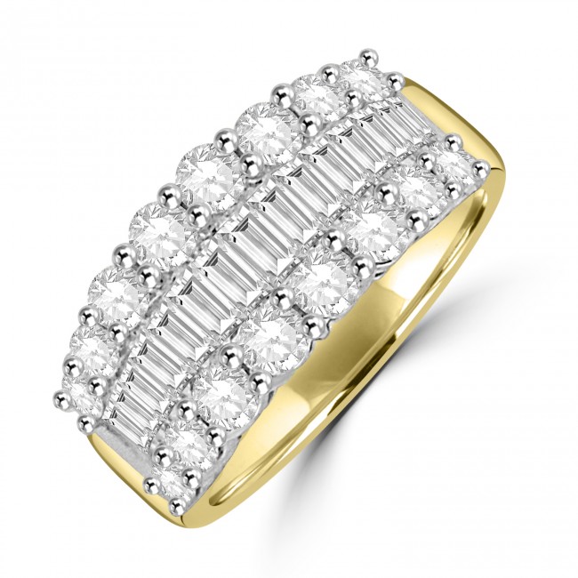 A modern classic, crafted beautifully in a two-tone platinum and 18ct yellow gold ring. A series of eight brilliant cut diamonds graduate in size and align both outer rows with dazzling brilliance. An inner channelled row of strikingly clear baguettes add definition and style.