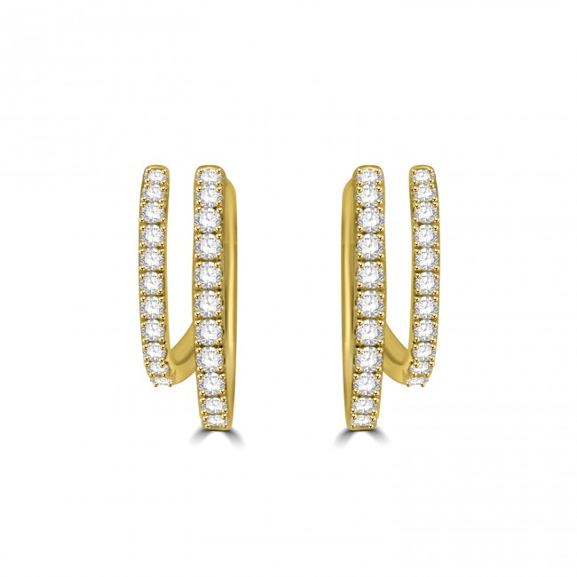 Radiant with castle set white diamond and warm and majestic, 18ct yellow gold. These hoop style earrings feature two oval shaped settings of diamond. Fitted by hinge and pincer back.