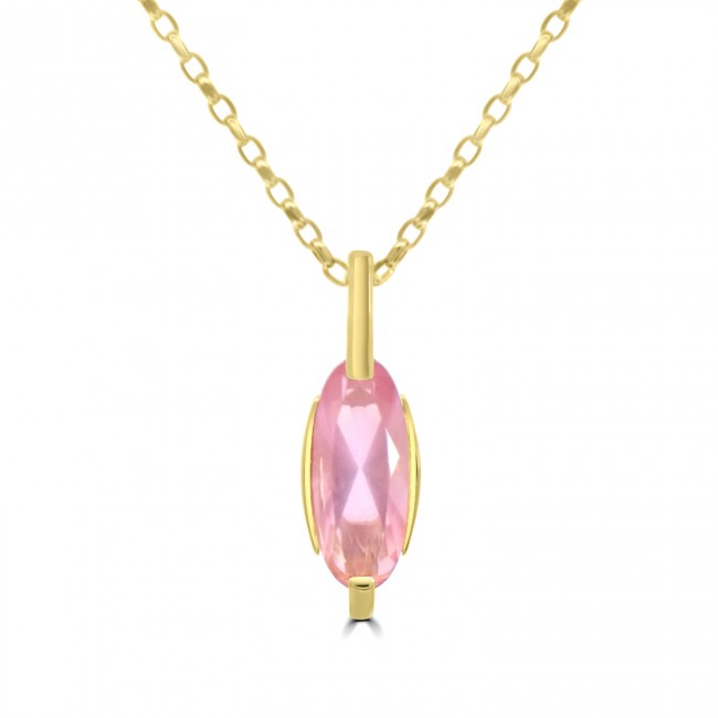 A long, sleek Oval cut reveals various shades of rose pink, radiating from this faceted quartz stone. Complemented in the rich tones of 9ct yellow gold in a tension style setting. Please Note: Chain shown for illustrative purposes only ~ Chain sold separately