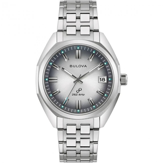 Straight from the 1970s comes the Bulova 1973 Jet Star, an iconic model from the brand’s impressive history, now equipped with an equally impressive movement. Inspired by the original, the silver-tone stainless steel case features a striking angular design with broad facets and a domed sapphire crystal. The silver sunburst dial is accented by a grey chapter ring, applied hour markers, and matching silver-tone hands. Luminescent plots at each hour and fill in the hands allow for exceptional legibility in every environment, while a date display sits perfectly at 3 o’clock. The new Jet Star is powered by Bulova’s proprietary high-precision quartz Precisionist movement, a revolutionary 8-jewel quartz mechanism vibrating at a remarkable 262kHz, accurate to seconds per year with increased resistance to temperature changes, and with a sweeping seconds hand. Complementing the stainless steel case is a matching bracelet with a deployment clasp closure and latched spring bars for easy release. Make an impression in legendary style with the high-flying Bulova 1973 Jet Star, an iconic design recreated for the modern connoisseur. 40mm case ~ 96B472