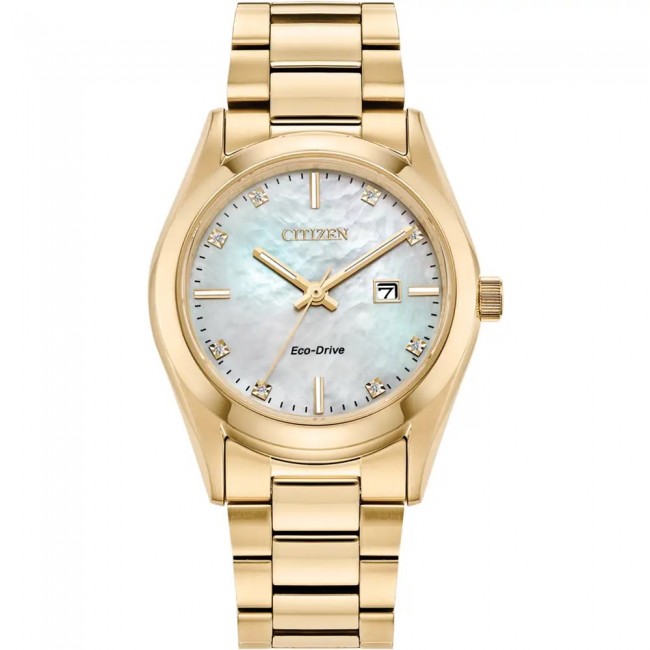 Elevate your daily looks with this timepiece from Citizen. Fusing wearability with feminine elegance, this timepiece is the ultimate day-to-evening watch to wear. The gold-tone stainless steel case measures 33mm in diameter and is presented on a gold-tone, 3-link stainless steel bracelet for a sleek, versatile wear on the wrist. The mother-of-pearl* dial features 8 diamond accents. With water resistance up to 100 metres and date display at the 3 o'clock position. Powered by Citizen’s proprietary Eco-Drive technology to provide light-powered vitality continuously and sustainably without ever needing a battery. 33mm Case ~ EW2072-59D
