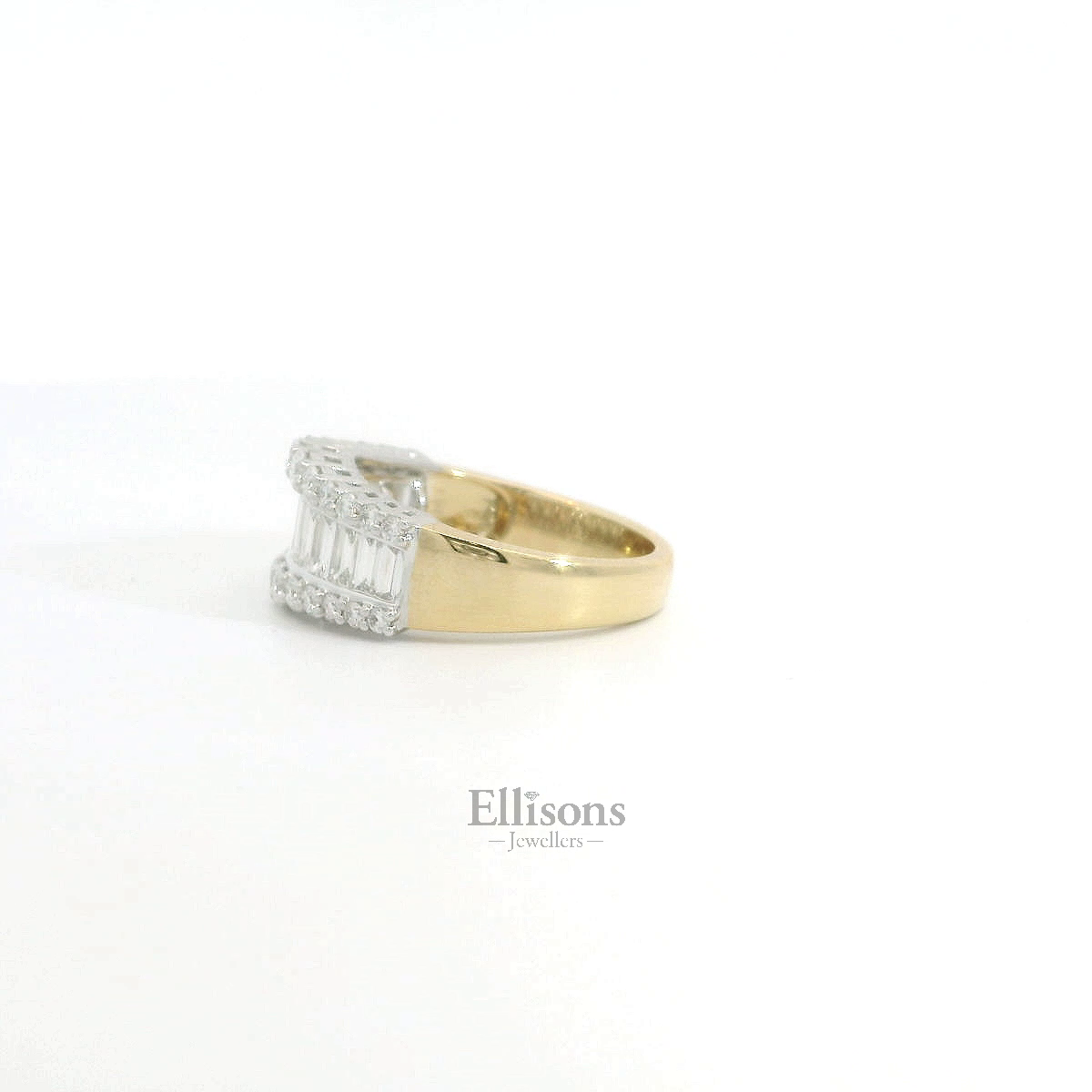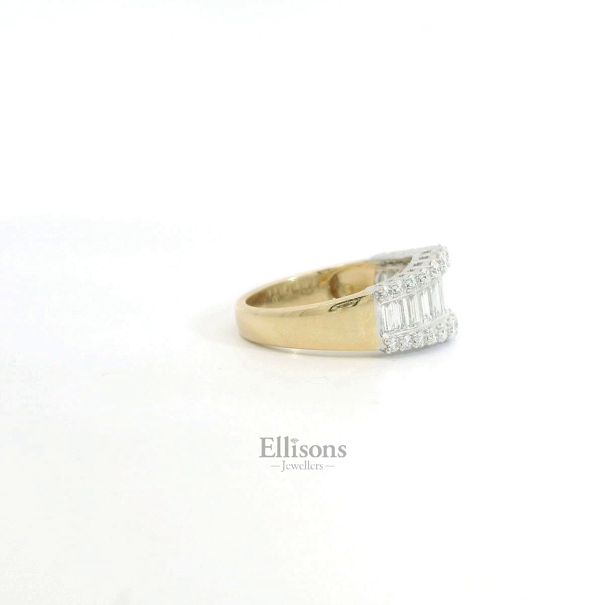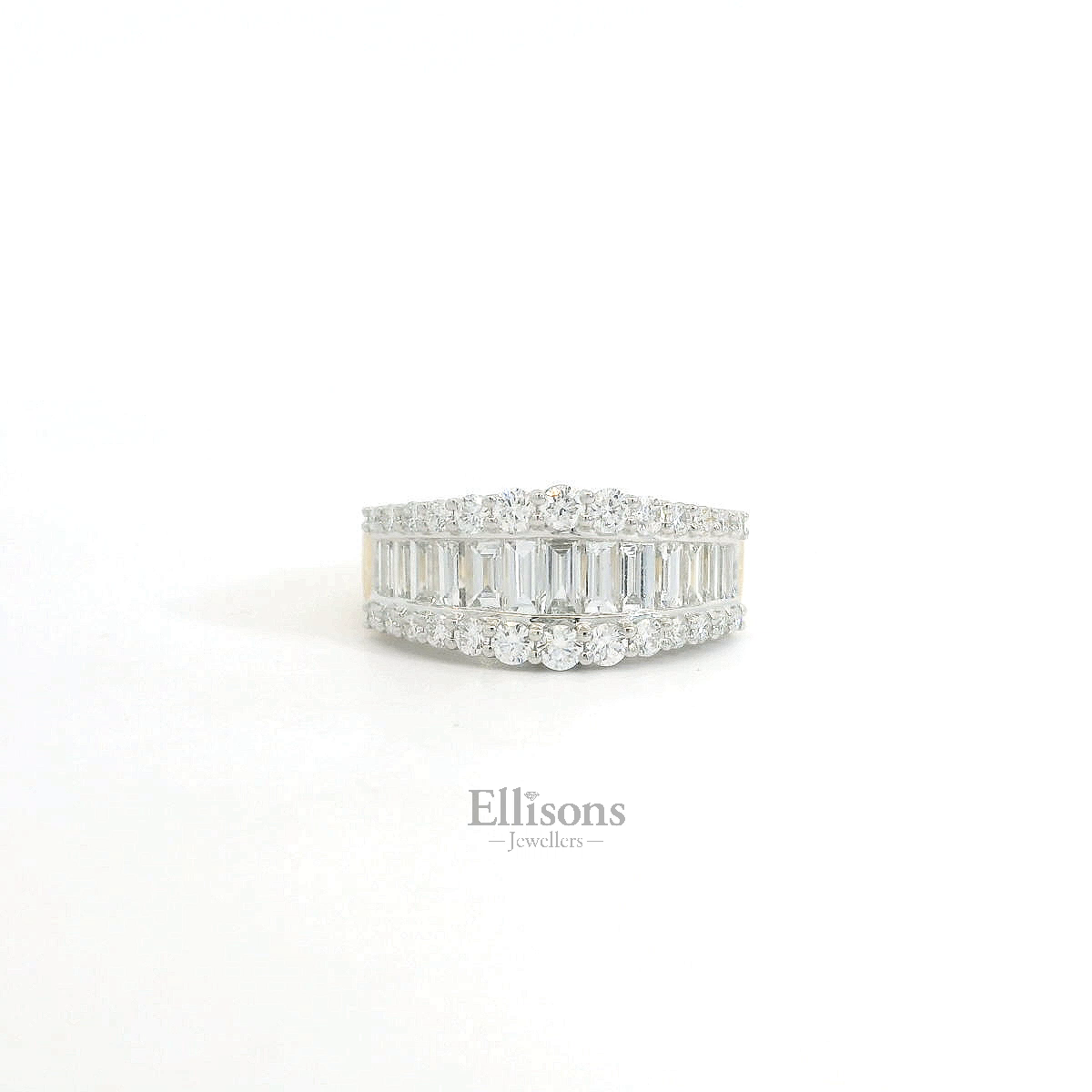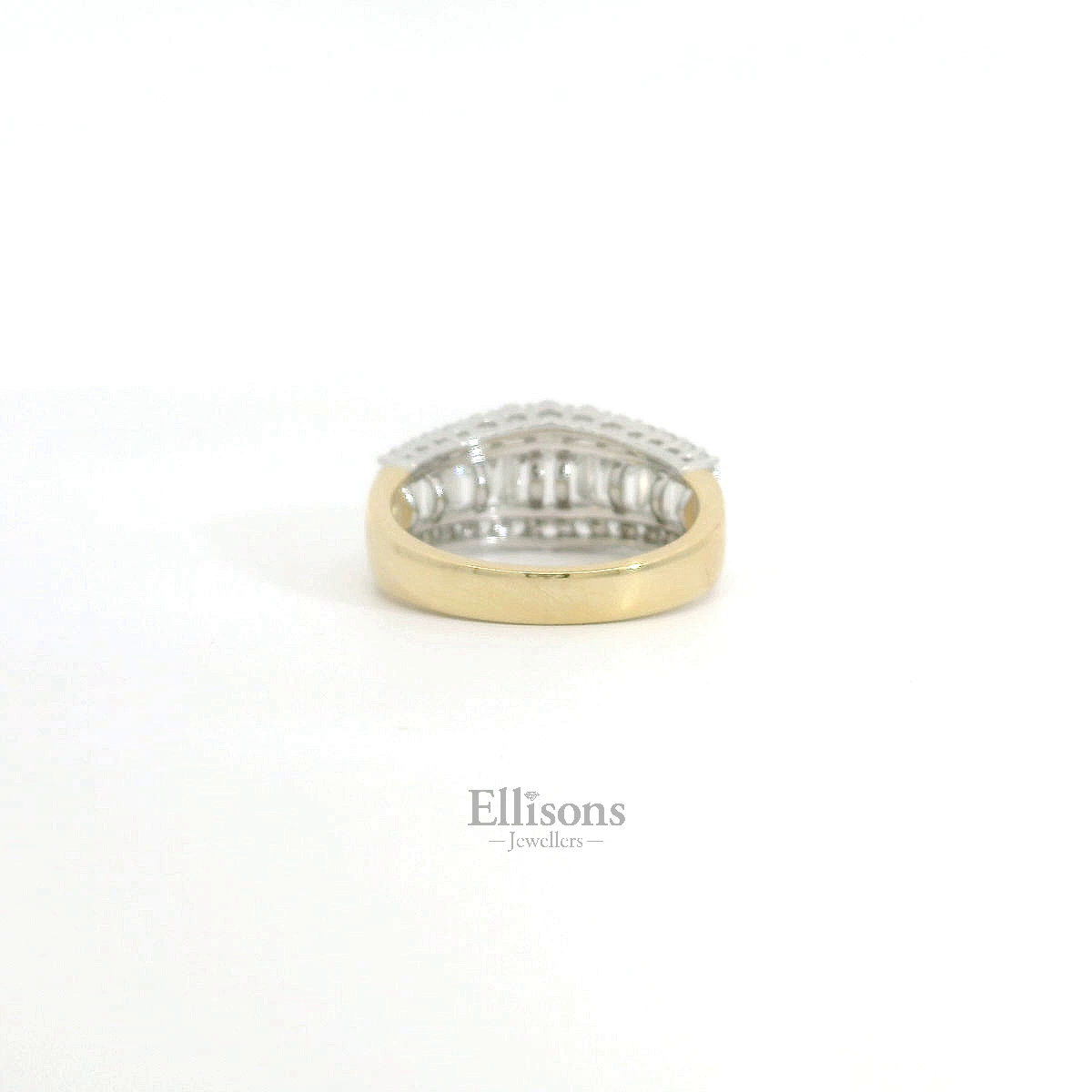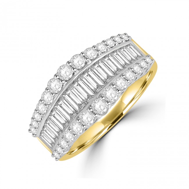 A series of strikingly clear, baguette cut diamonds graduate in length, offering a broader focal point in centre. Outer rows of claw set brilliant cut diamonds follow suit and intensify the scintillation. The shaped setting is crafted in platinum and contrasts with the warm tones of an 18ct yellow gold shank. A versitile ring, beautifully make with impressive attention to detail.