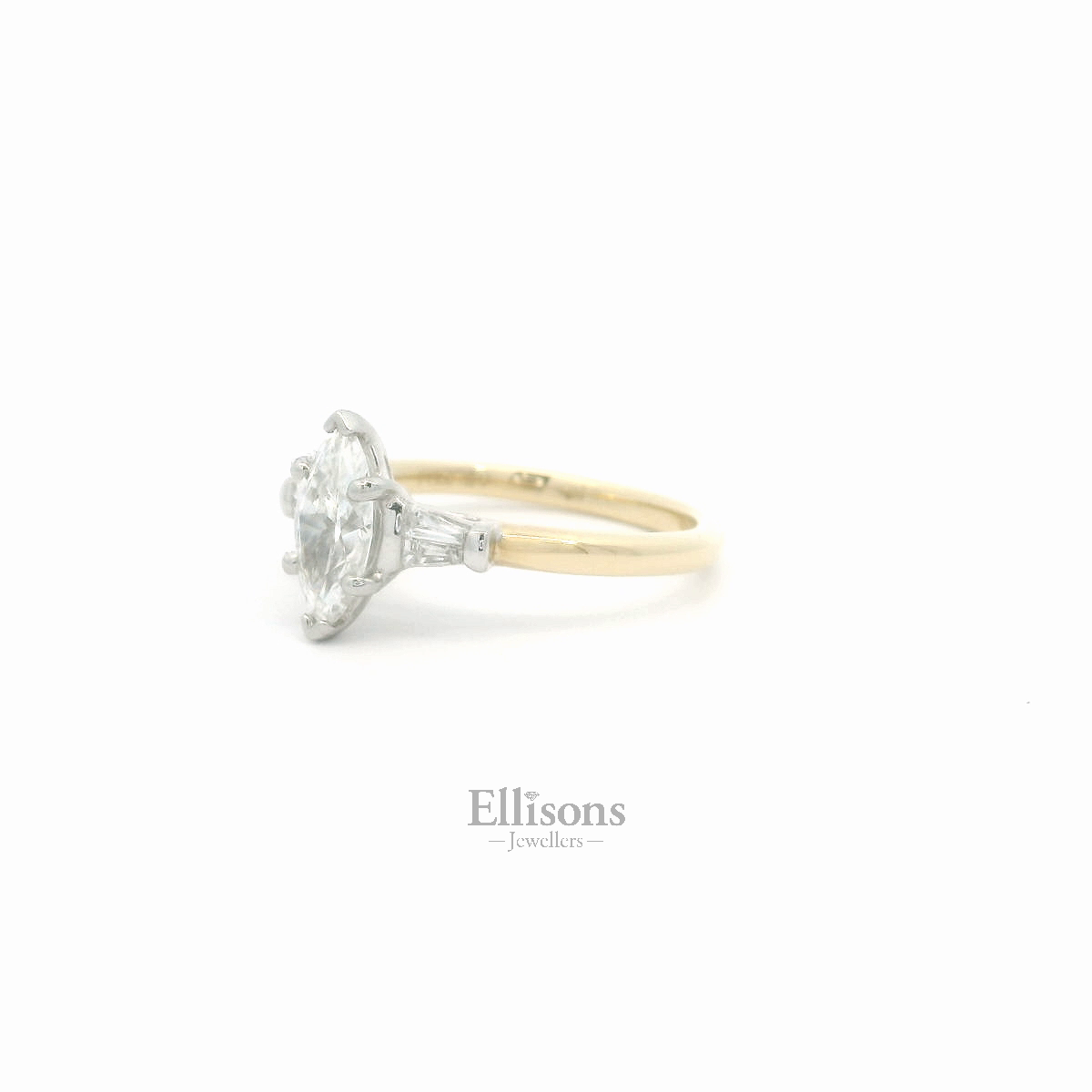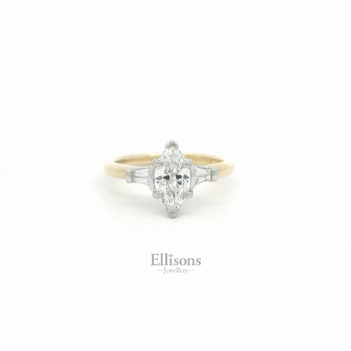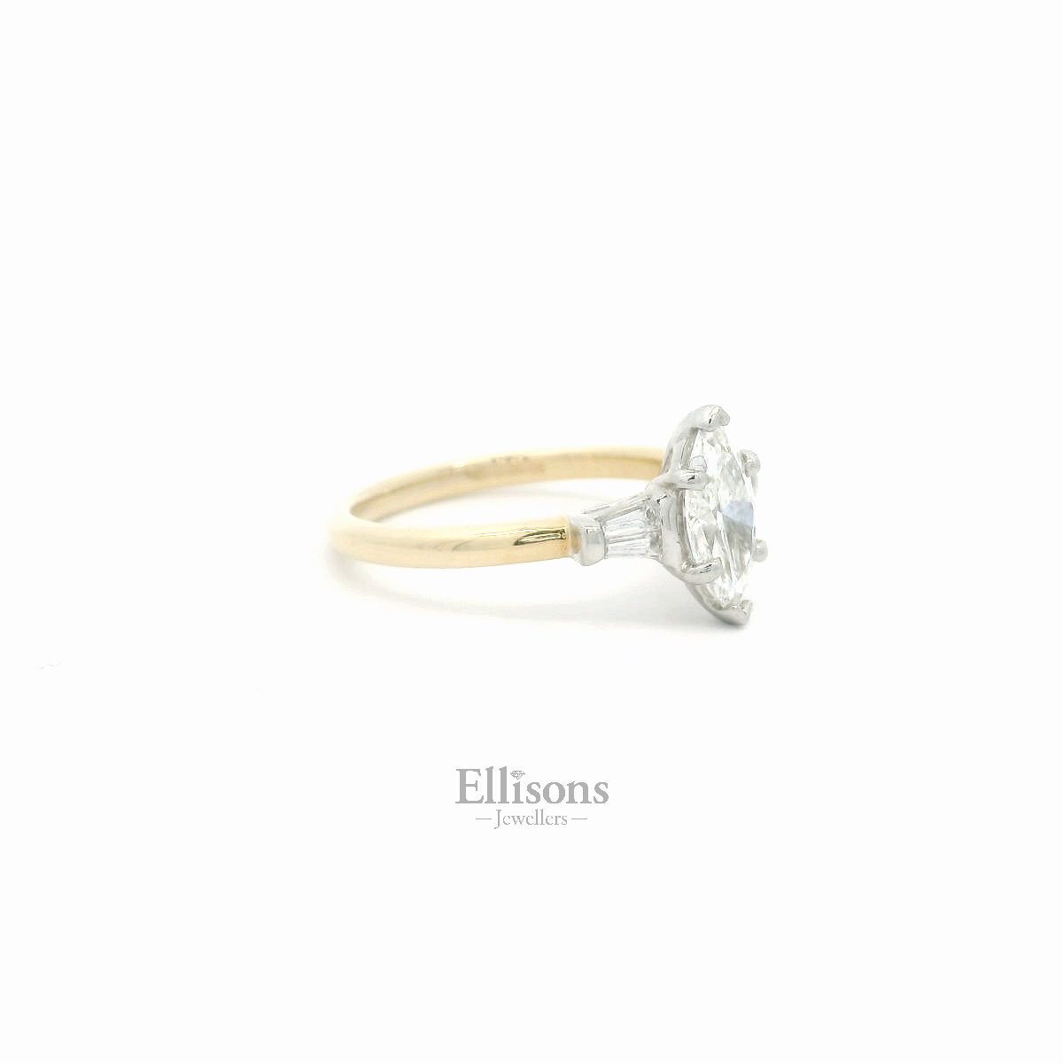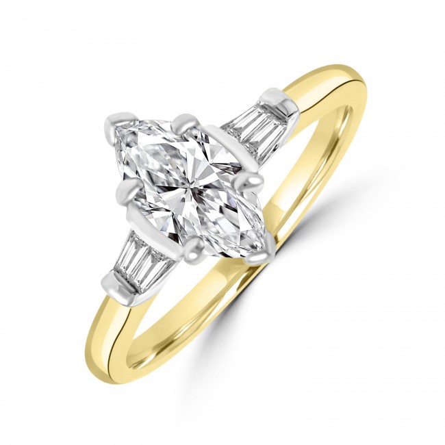 A beautifully proportioned, Marquise cut Diamond is held subtly in silky platinum. The white brilliance blends seamlessly with a tapered diamond baguette on either side. The setting is raised within an 18ct yellow gold shank, to allow for a perfect wedding ring fit.