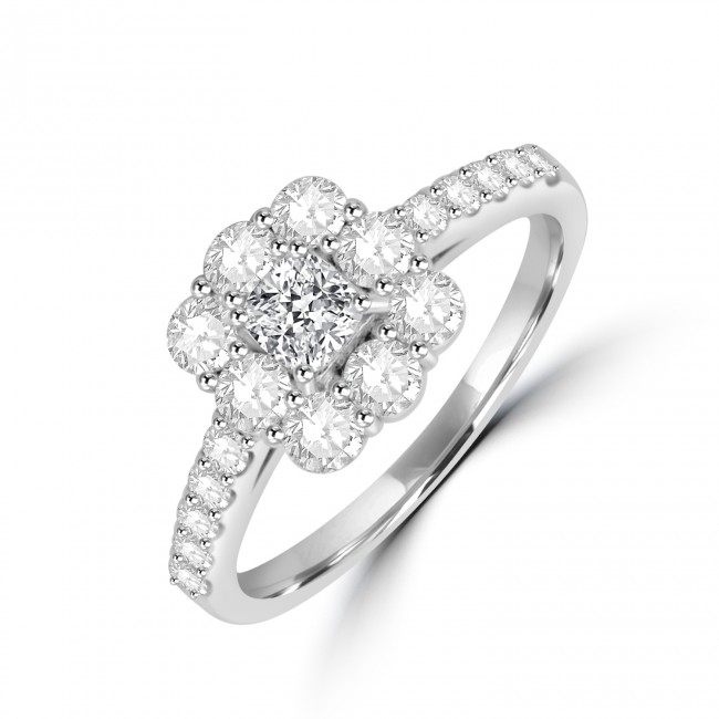 A beautifully elegant design with electifying brilliance. A soft-cornered, cushion cut diamond is positioned centre focus within a surround of impressively sized, round, brilliant cuts. The brilliance continues down the diamond set shoulders. Crafted in Platinum.