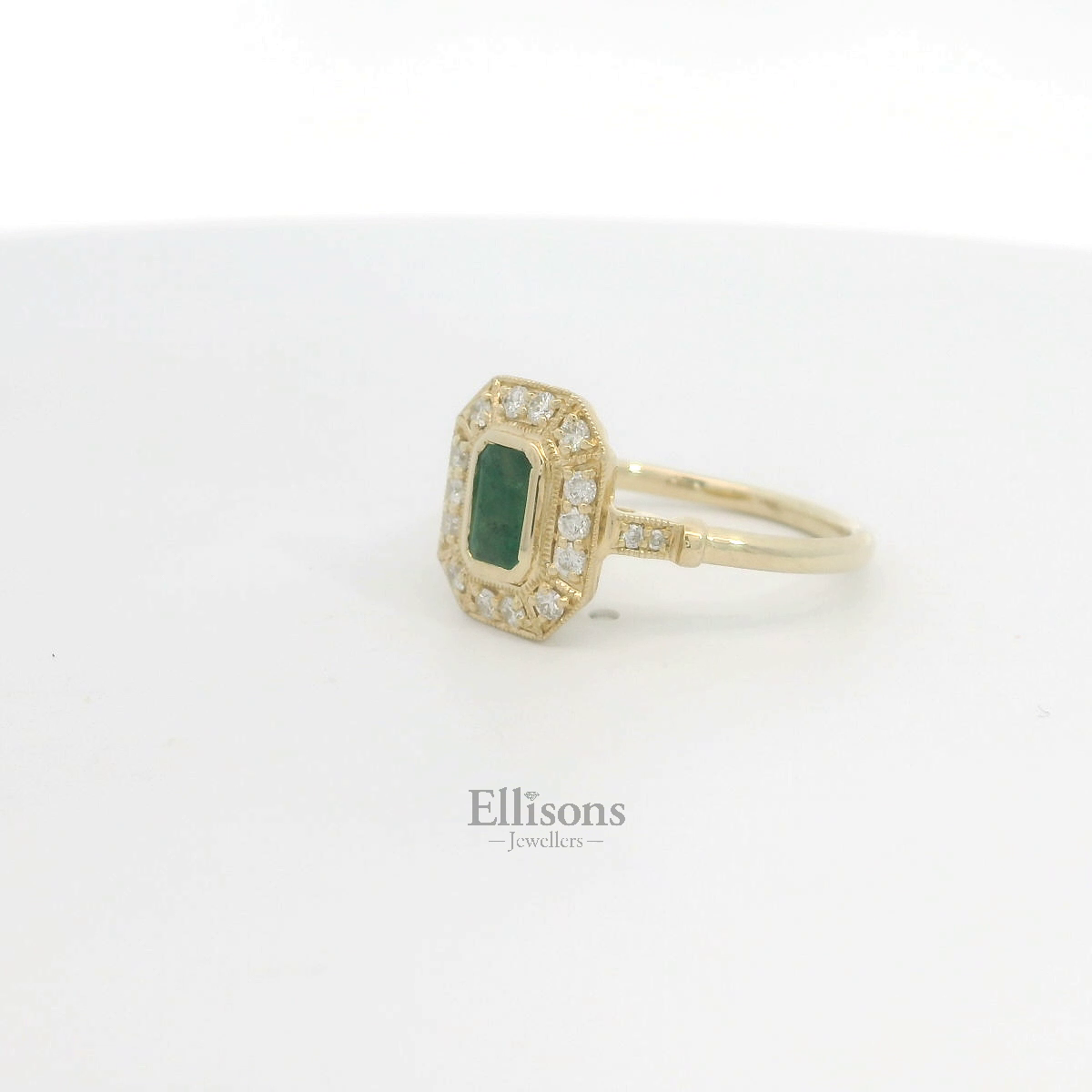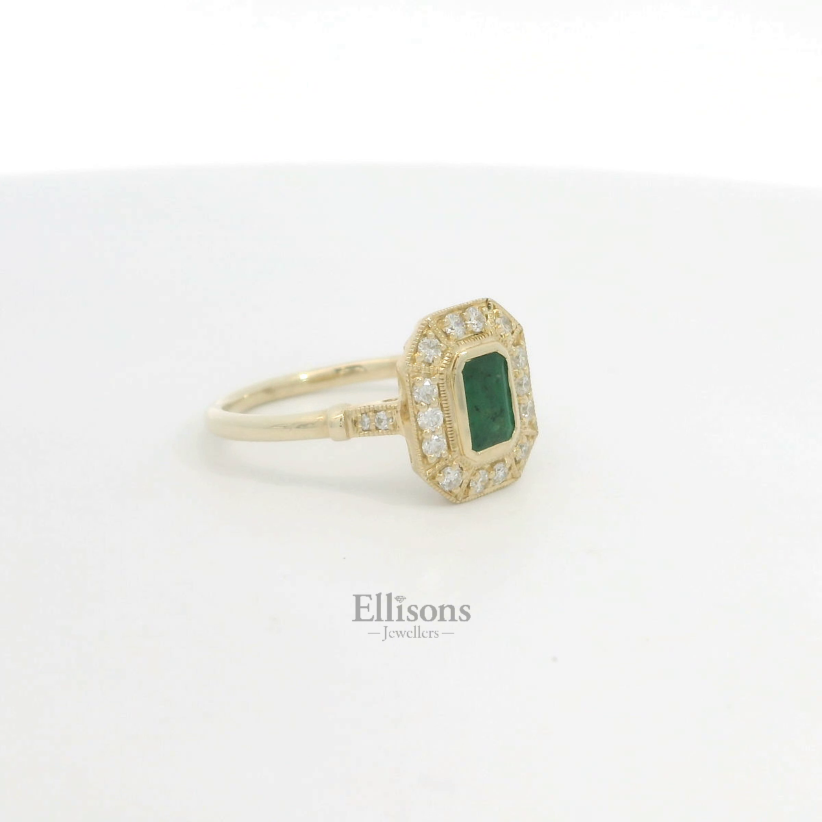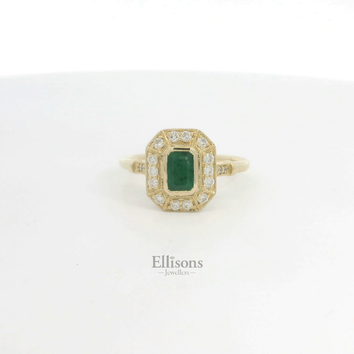 A deep, green emerald is set flush in the warm tones of 9ct yellow gold. The setting is enlightened with diamond brilliance in an ornate, grain set surround that continues in the shoulders of the band.