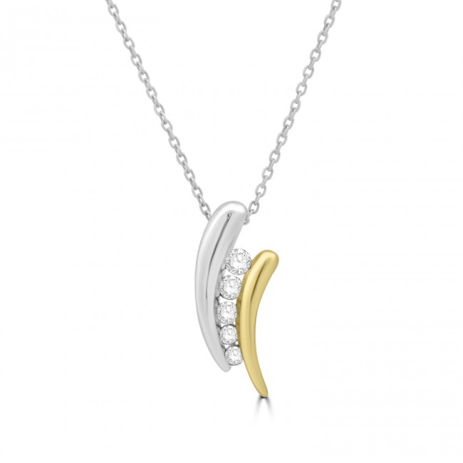 An exquisite and elegant design contrasting silky white brilliance with the warm tones of 18ct gold. Five round brilliant cut diamonds are channelled between soft, abstract surfaces of white and yellow gold. The pendant is seamless fitted on a 17" diamond cut trace chain.