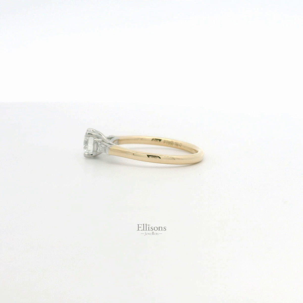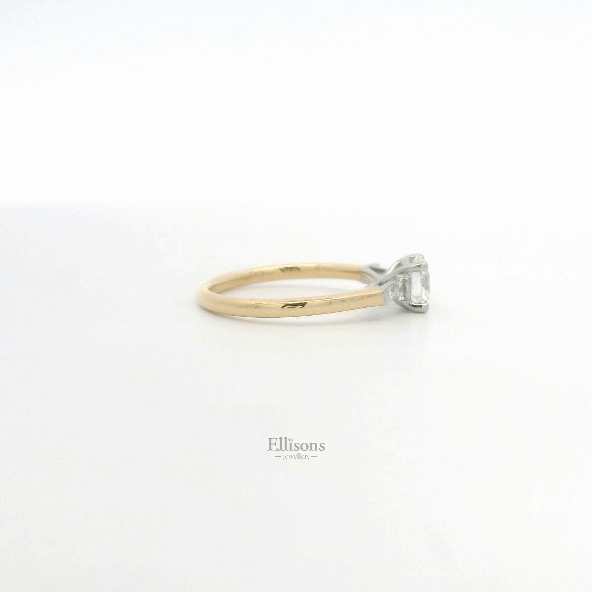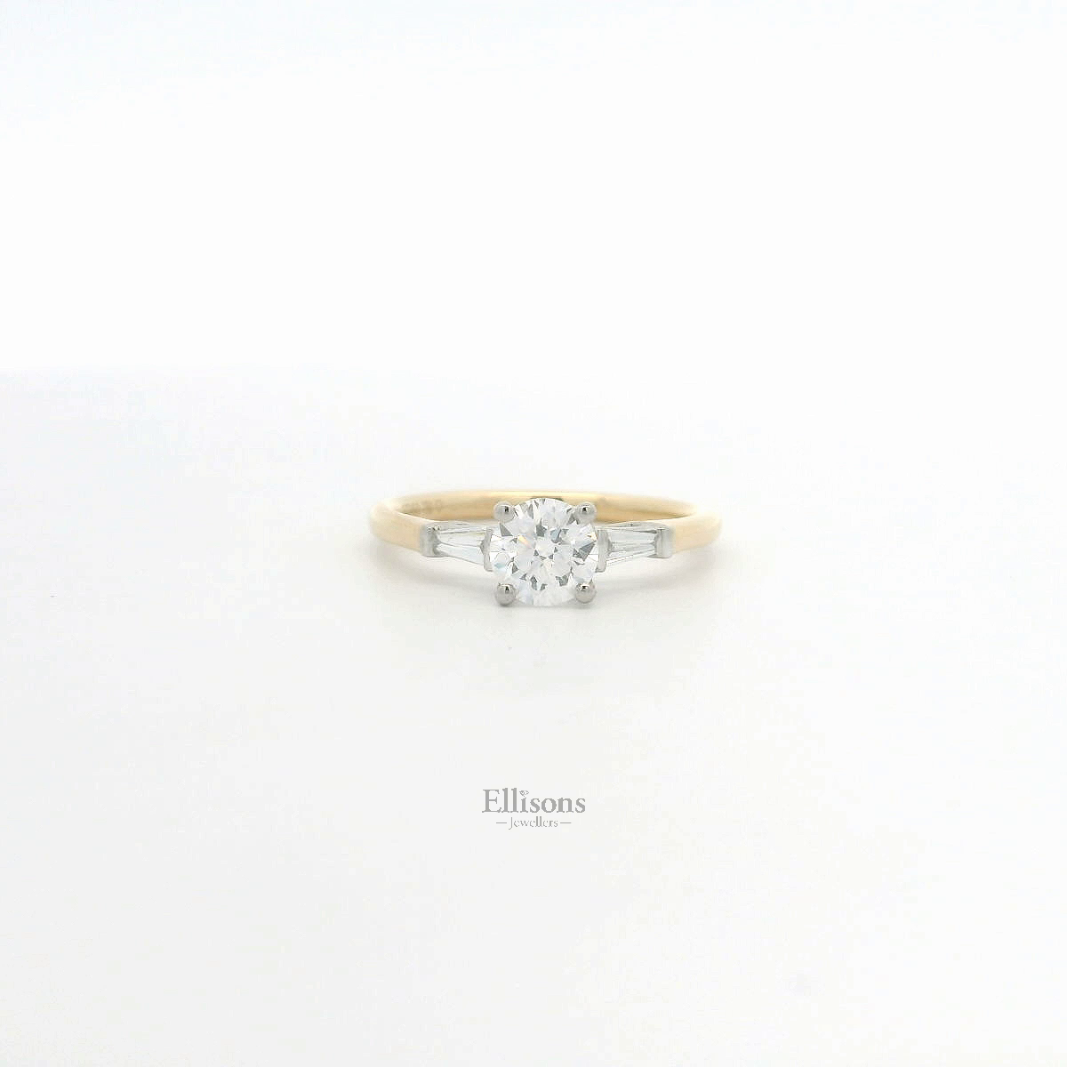 An impressive round, Brilliant cut Diamond is accentuated with a tapered baguette on each shoulder. The understated setting is crafted in Platinum, within an 18ct yellow gold shank. Brilliant cut .64ct Diamond ~ GIA Certified Report. 2514238291 D colour ~ Si1 clarity ~ Excellent Cut/Polish/Symmetry ~ Fluorescence None
