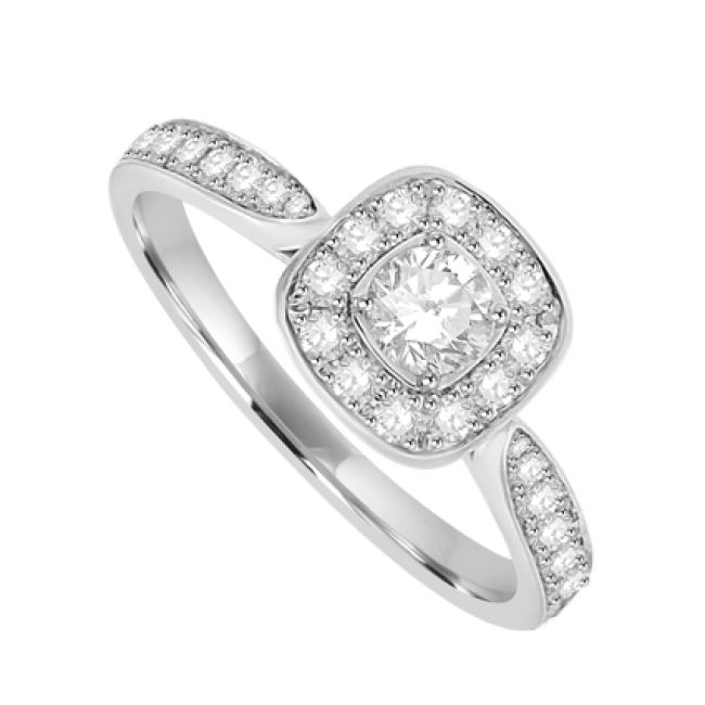 An attractive cushion-shaped halo surrounds a striking, brilliant cut diamond claw set above.