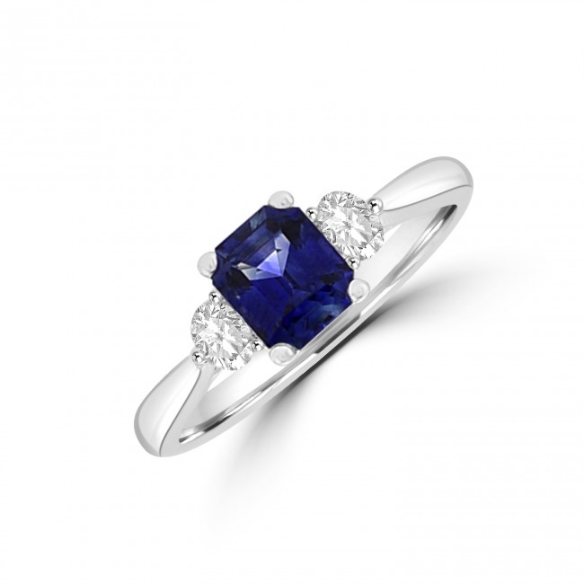 Rich and luxurious, electric blue tones radiate from this vibrant, emerald cut Sapphire in centre focus. A brilliant cut Diamond, clawed on each side compliments the overall spectacle beautifully.