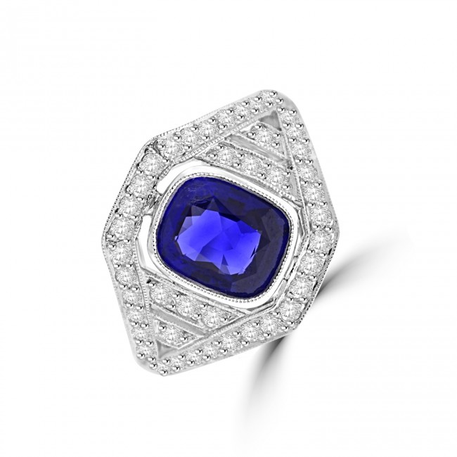 A long proportioned, cushion cut Blue Sapphire is set flush in a smooth, rub over style setting with a millegrain edge. The focal point is bedazzled with a surrounding .52ct white diamond, grain set within a tapering, art-deco style design.