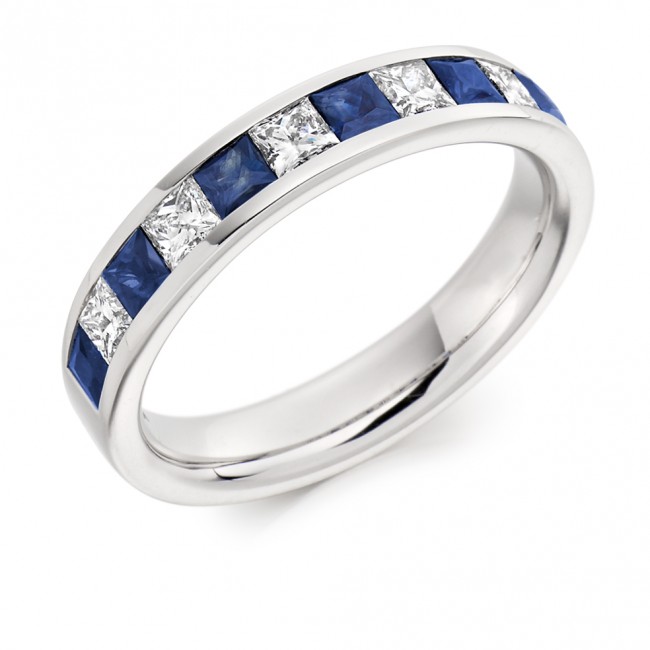 Six princess cut Sapphires alternate with five princess cut Diamonds in a smooth, channel setting. The band is courted on the inside for a comfortable fit and silky rounded, edges. The profile is beautifully low so as to compliment an engagement ring worn alongside.