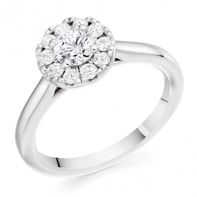 The stunning "E" colour Brilliant cut proves worthy of centre focus within a dazzling array of diamond fire and brilliance. Ten claw set diamonds surround, claw set within a wedding friendly mount.