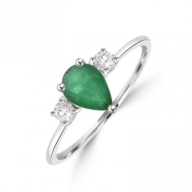 Elegant and beautifully refined, this understated three-stone compliments a pear cut Emerald iin centre focus between two brilliant cut diamonds. Made in luxurious, 18ct white gold with a fine band.