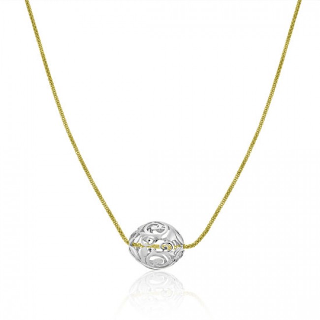 The white gold bead has been beaiutifully pierced to cut out the popular Tree of Life emblem. This moves freely and contrasts effectively with a yellow gold honeycomb style chain.