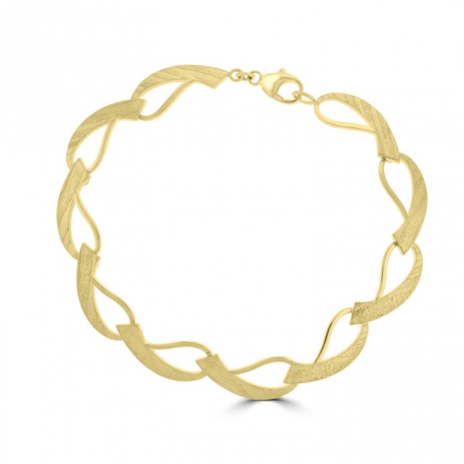 Made in solid, 9ct gold and contrasting smooth, polished tones with textured satin surfaces, this Sueno bracelet exhibits refined quality and design. Wave-shaped links form a sequence 7.5" in length and fitted by lobster catch. Made and designed in Germany.