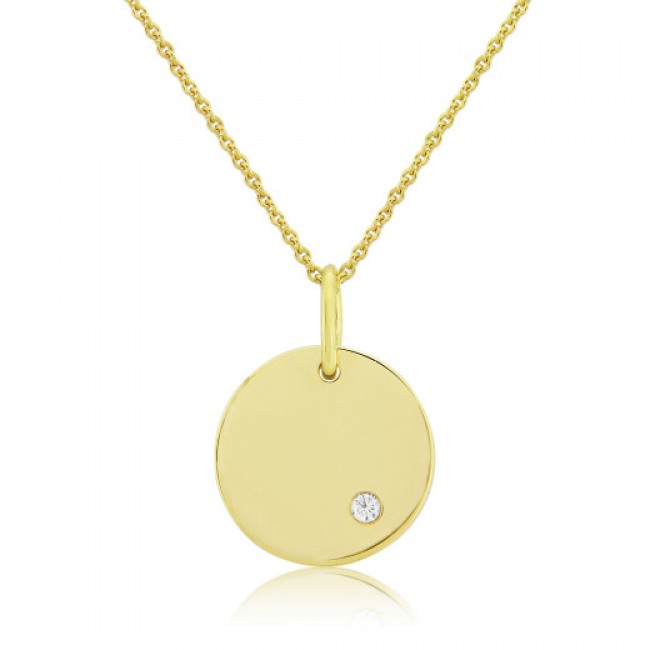 A beautifully understated pendant, featuring a 15mm round disc (1mm thick) with a flush set diamond. The plain bale is fitted to an 18" chain with adjuster ring for shortening.