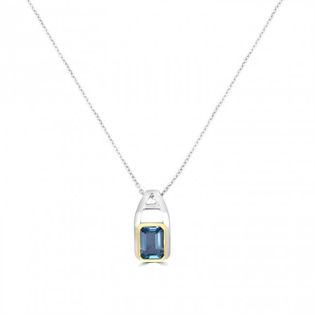 A striking emerald cut Blue Topaz radiates refreshingly cool blue tones from within a flush, bezel setting of yellow gold. The remainder of the pendant contrasts in silky white gold. Please Note:- Chaiin sold separately and shown for illustrative purposes only.